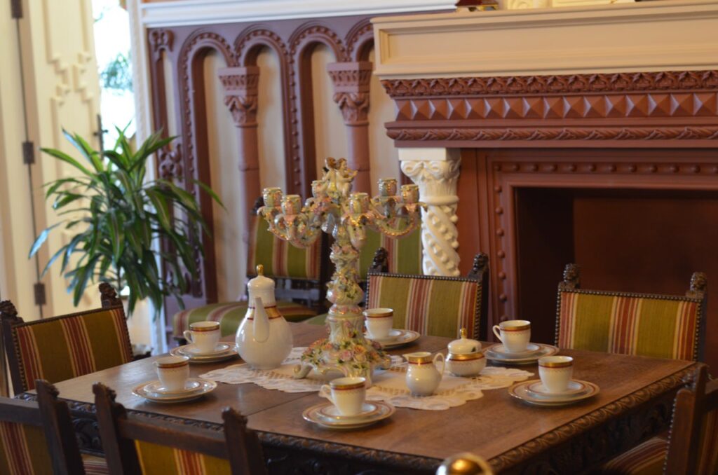 Внешний облик усадебного дома украшают шатры башен, мансардные крыши, встроенные на главном входе фигуры горгулий. А внутренние залы — своего рода путеводитель по истории архитектурных стилей в интерьере. Здесь сочетаются элементы более десяти стилей — готический и романский, рококо, маньеризм, барокко, классицизм…